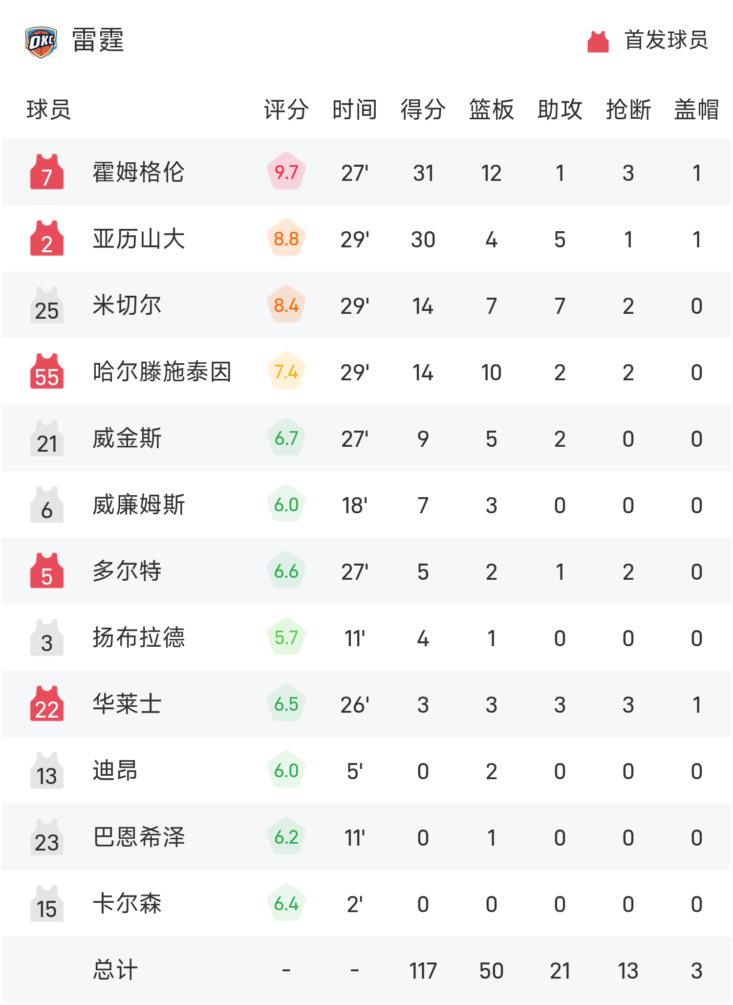 होल्मग्रेन ने गेम में सर्वाधिक 31 अंक, 12 रिबाउंड और 1 सहायता हासिल की, जिससे थंडर जीत की ओर अग्रसर हुआ।